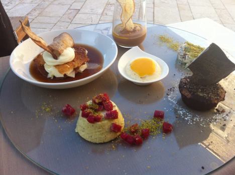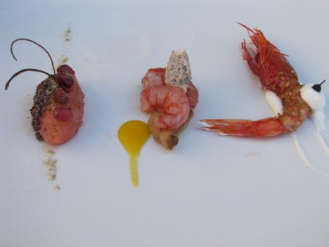Evoluzione del gambero – con un percorso che va dalla tartare di gamberi e agrumi,scaglie di fave di cacao, polvere di liquirizia e chicchi di melagrana, passando per i gamberetti su animelle scottate alla semola Senatore Cappelli e fois gras di lardo di suino al caffè e cognac, finendo con un gambero scottato con gomasio su mouselline di ricotta e pepe cubebe.