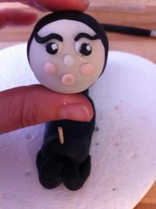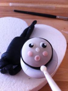 con pochissima pdz nera formo le ciglia e le sopracciglia, con la n°4, altri due pois , le pupille, con la stessa ne faccio altre 3 rosa confetto, di cui due saranno le guanciotte, la terza con una leggera pressione l’ appoggio al viso formando la bocca.