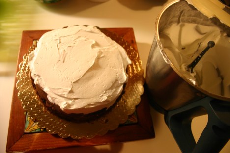 lo farcisco con uno strato di panna ed uno di nutella, metto sopra l’altro disco di pan di spagna e lo bagno nuovamente. Ricopro il tutto con uno strato sottile di panna aiutandomi con una spatola. Lo metto in frigo e lo faccio rassodare per almeno 10ore.