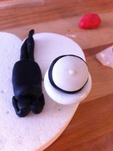 Con la pdz nera formo un cilindro che appiattisco , e lo appoggio delicatamente sulla torta piegandolo leggermente in su ad una estremità dove attaccherò dopo aver inserito mezzo stuzzicadenti la testa., con altri due cilindri molto più sottili appiattendo la parte finale formo i piedini, altri due ancora più piccolini e sottili , le braccia. Stendo la pdz rossa. e con un taglia biscotto a forma ovale , creo la corazza della coccinella, stendo la pdz nera e con la bocchetta n° 4 creo tanti pois che attacco con il pennellino sulla stessa, dopo formo due palline rosse di eguale misura e con un’ attrezzino arrotondato faccio una pressione al centro modellandola sul piedino della coccinella formo la scarpetta, adesso inizio la creazione delle coccinelle piccoline con la pdz formo due palline, quella nera più piccola e quella rossa più grande e più allungata, con il colore alimentare nero disegno tanti pois neri.