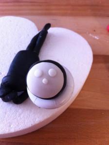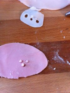 Inizio a creare la coccinella “chic”, formo una palla con la pdz nera, della grandezza di una pallina da ping pong, sarà la testa ; stendo la pdz rosa chiaro e con un taglia biscotto tondo formo il viso, con la bocchetta n° 8 formo due pois bianchi che saranno gli occhi ,