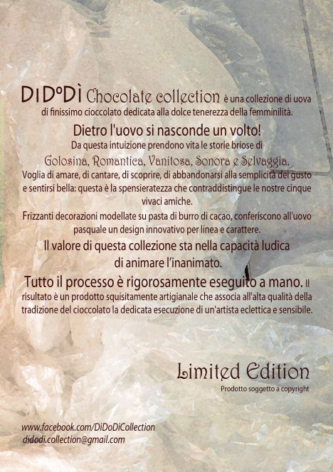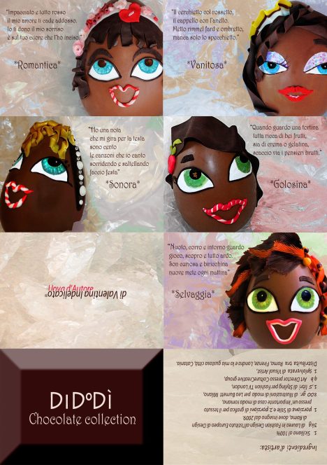 E così, dall’idea di rappresentare un vero e proprio “mondo al femminile”, nasce DiDoDì (acronimo di discreta dolce e dinamica) chocolate collection, un brand che si propone di coniugare l’antica arte della lavorazione artigianale del cioccolato ad esigenze di originalità della presentazione del prodotto. Il tutto secondo un’ottica esclusivamente e dichiaratamente femminile.