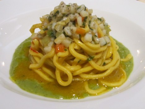 Finchè arriviamo al piatto che Peppe ha espressamente preparato su nostra richiesta e che non ha deluso le aspettative, il Chitarrone con ragout di seppia su macco di favuzze, piselli e finocchietto. Parlo di “espressamente” perchè il chitarrone era ” fresco d’impasto”!! Inoltre, perfetto matrimonio fra seppia e legumi (soprattutto perchè di stagione), e una lode alla leggerezza del ragù !