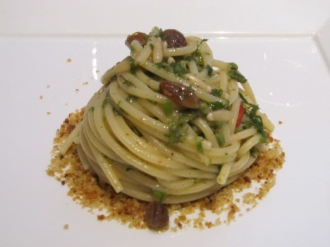 A questo punto arriva il “piatto povero” che per me rappresenta la sicilianità, ed infatti il suo nome Espressione di un territorio me ne da conferma. Un ottimo Spaghetto di Gerardo di Nola, aglio in camicia, prezzemolo, peperoncino, acciuga di Sciacca,Bottarga di Favignana, finocchietto di Licata, Colatura di Alici di Cetara, pistacchio, pinoli, uvetta e polvere di capperi. Il tutto assolutamente ben equilibrato, perfetta sapidità, ed utilizzando degli spaghetti di Gragnano, dalla caratteristica rugosità , ha ottenuto una perfetta mantecatura.