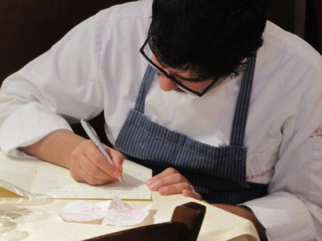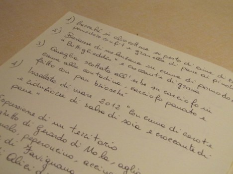 E ci consegna il menù appena degustato scritto manualmente da lui, proprio perché tutto è stato preparato al momento.