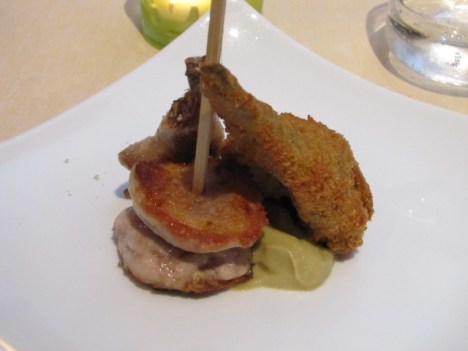 Successivamente una Quaglia scottata all’erbe su carciofoni, crema contadina, carciofo panato e fritto con pan brioche, altro piatto ben aromatizzato e di perfetta cottura, forse un pò troppo dolce.