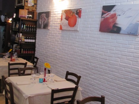 Ad accoglierci troviamo Chiara, moglie e manager ( così scherzosamente da noi soprannominata) di Peppe Bonsignore. Il locale, seppur poco luminoso, è reso accogliente da un muro in pietra bianca con grandi foto su tela che portano la firma dello stesso Peppe, e dalla grande quantità di vini e prodotti alimentari di nicchia, che scopro essere in vendita.