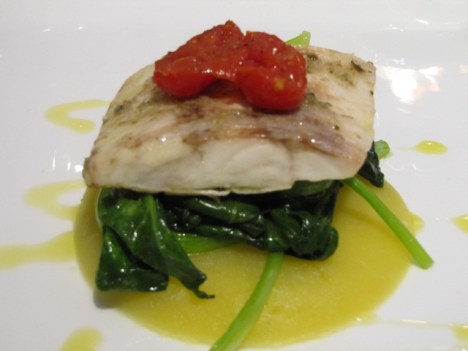 Ultimo piatto prima del dessert, una freschissima Spigola d’amo su patata affumicata alle mandorle con spinaci croccanti e datterino al forno. La carne della spigola ,cotta con il calore di un forno in fase di spegnimento, è assolutamente succulenta e morbida, l’affumicatura “casalinga” della patata mi ricorda la cottura sulle braci dove venivano bruciate le “scocci di mennula“, gli spinaci appena scottati ,ed il datterino dall’eccezionale dolcezza, creano un connubio perfetto.