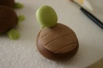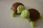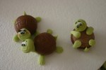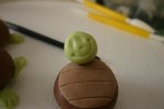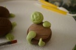 Coloro la pdz bagnandola a poco a poco con il colorante blu e giallo ottenendo verde chiarissimo, poi con gli altri coloranti ottengo il marrone, verde più scuro e una piccolissima quantità di gialla e nera. Inizio a creare le tartarughine, con la pdz marrone modello una palla che appiattirò leggermente da un lato, con un po’ di pdz bianca schiarisco una parte di pdz marrone che stendo con il mattarello piccolo e con il taglia biscotto ovale ottengo la corazza della tartarughina capovolta, la attacco alla palla marrone con il pennello bagnato nell’acqua e con il taglia pizza faccio dei leggerissimi tagli verticali, la corazza!