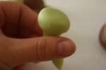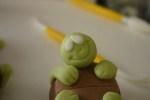 Adesso con la pdz verde più scura formo un cilindro che arrotondo da un estremità ottenendo la testa, e l’attacco alla corazza, con uno spillo disegno, facendo una leggera pressione alla pdz, la bocca, i buchini per il nasino e gli occhi con l’attrezzino a punta tonda, con la stessa pdz modello le zampine dove faccio dei taglietti con il taglia pizza, e la coda.