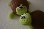 Adesso con la pdz bianca faccio gli occhi e con la pdz nera, usando la bocchetta n°4 e 2, li completo. Con lo stesso procedimento faccio altre due tartarughine, queste non saranno rovesciate, e con la rotella taglia pizza disegno la corazza,per la femminuccia, con un po’ di pdz nera, faccio le ciglia e con un colorante alimentare rosa faccio le guanciotte. Le tartarughine sono pronte!