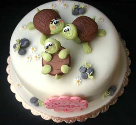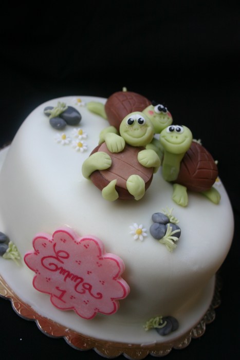 Adoro questi animaletti, con la robustezza e solidità del carapace, sin da piccola le invidiavo perchè le immaginavo protette dentro la loro “casetta“. Inoltre mi trasmettono un grande senso di forza e di pazienza!! Qualche tempo fa ,mi venne chiesto di preparare una torta per festeggiare il primo anno di una bimba, Emilia, con delle tartarughine di zucchero… iniziai i preparativi, felice di poter creare un soggetto da me tanto amato! E, come sempre, vi racconto il procedimento, ricordandovi che il primo passo è sempre quello di preriscaldare il forno a 180° ,ed in questo caso utilizzare una teglia rotonda di diametro 20 cm, quella sarà la base della torta!