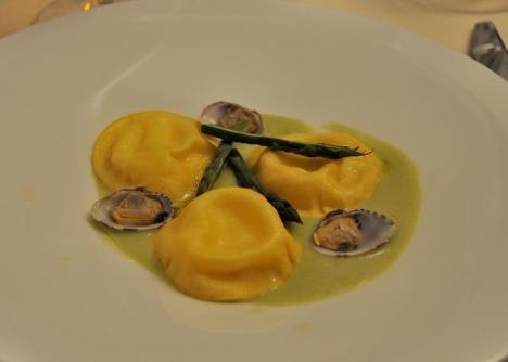 ravioli di burrata su crema di asparagi, vongole e colatura di alici;