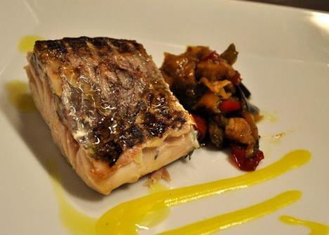 trancio di dentice cotto a bassa temperatura con verdurine di stagione e crema di patate allo zafferano;
