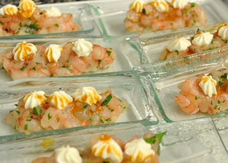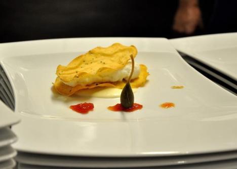 il cucchiaio di gamberi e ricotta profumata al limone ed emulsione di ricci di mare;