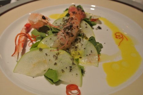 Il primo starter e’ un crudo di scampo con lingotto di caviale Calvisius, insalata di mela verde e rucola, succo del frutto della passione, peperone e pernod, piatto ben fatto e di grande semplicita’ nonostante il gran numero di ingredienti utilizzati, mixati assieme con perfetto equilibrio.
