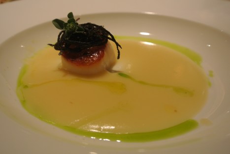 A seguire, crema di patate e porri, capasanta croccante, riccioli di lingotto di caviale Calvisius e olio al basilico, una bella complessita in bocca, anche questa una bellissima emozione al palato,i n abbinamento a Chiquet B. Blancs AY 0.