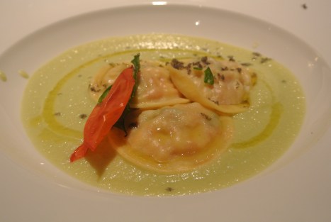 Passiamo al primo: Ravioli di gamberi e pomodori canditi al basilico, crema di zucchina estiva e lingotto di caviale Calvisius grattugiato, in abbinamento a Aubry Brut; anche questo piatto ben congeniato e perfetto per far risaltare la sapidita’ del caviale.