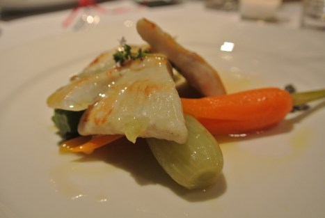 A seguire Filetto di Rombo scottato alle erbette della macchia mediterranea, verdurine baby su sfoglia di lingotto di caviale Calvisius e salsa allo champagne, in abbinamento a Egly Ouriet Tradition.