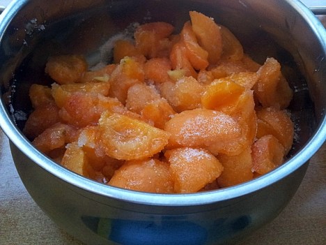 Lavate 1,2 Kg. di albicocche, denoccionatele, tagliatele in quattro e ponetele in un recipiente; aggiungete 300 gr. di zucchero, il succo di mezzo lime e 2 cm. di zenzero tagliato a pezzettini (se lo preferite), mescolate bene e dopo aver coperto il recipiente, ponetelo in frigo per circa 1 ora.