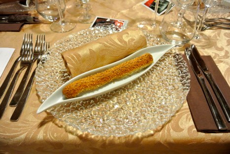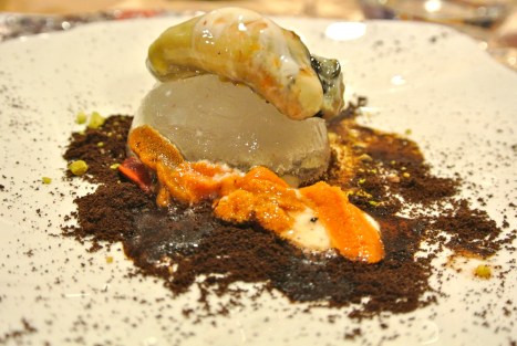 Ostrica fino alla fine del mondo (dedicata a Roy Paci), un ostrica con salsa allo yoghurt speziato, ricci di mare e polvere di caffe’, anche questo un piatto intrigante e complesso (forse tun po’ troppo spinto e con massiccia dose di caffeina che lascia poco spazio all’ostrica).