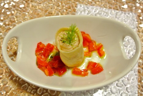 U Pani cu’ scuimmu, ovvero un cannolo di pane bianco ripieno di mousse di sgommbro con pomodoro e cipolla rossa di Tropea ed olio al basilico, simpatico assaggio fresco, un ottimo inizio.