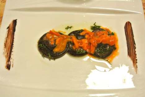 “il dialogo tra terra e mare” ovvero un raviolo al cacao, ripieno di gambero rosso e ricotta al limone, con burro di bufala, salvia e ricci di mare.