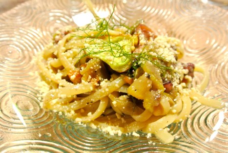 a seguire…”la piovra” , linguine di gragnano con ragu’ di polpo al nero d’avola e cucuzza fritta con finto formaggio di pinoli.